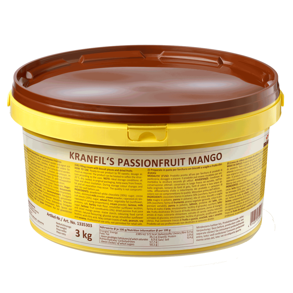 Ready to use crunchy filling with 30% white chocolate, dried fruits and 20% biscuit pieces, without palm oil.