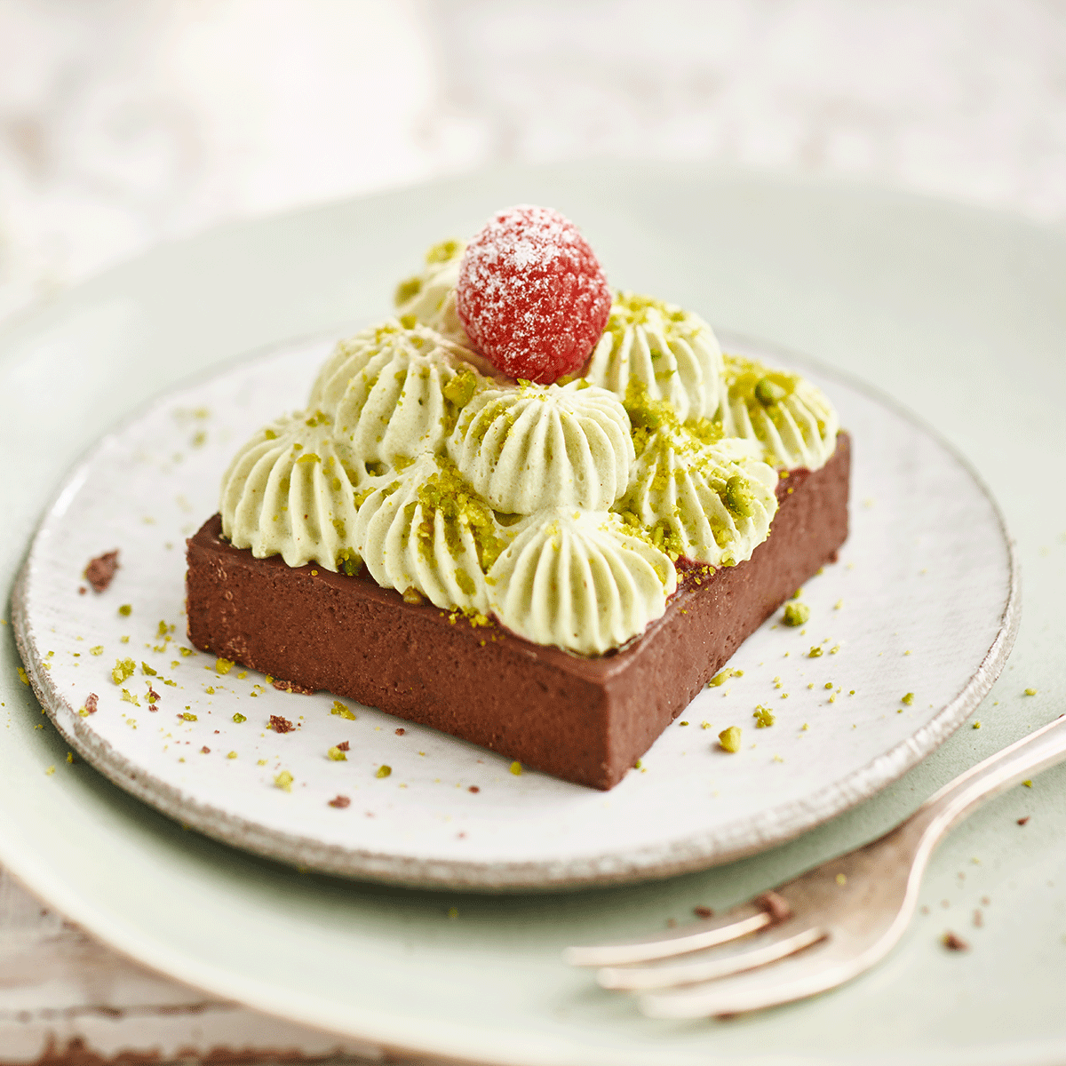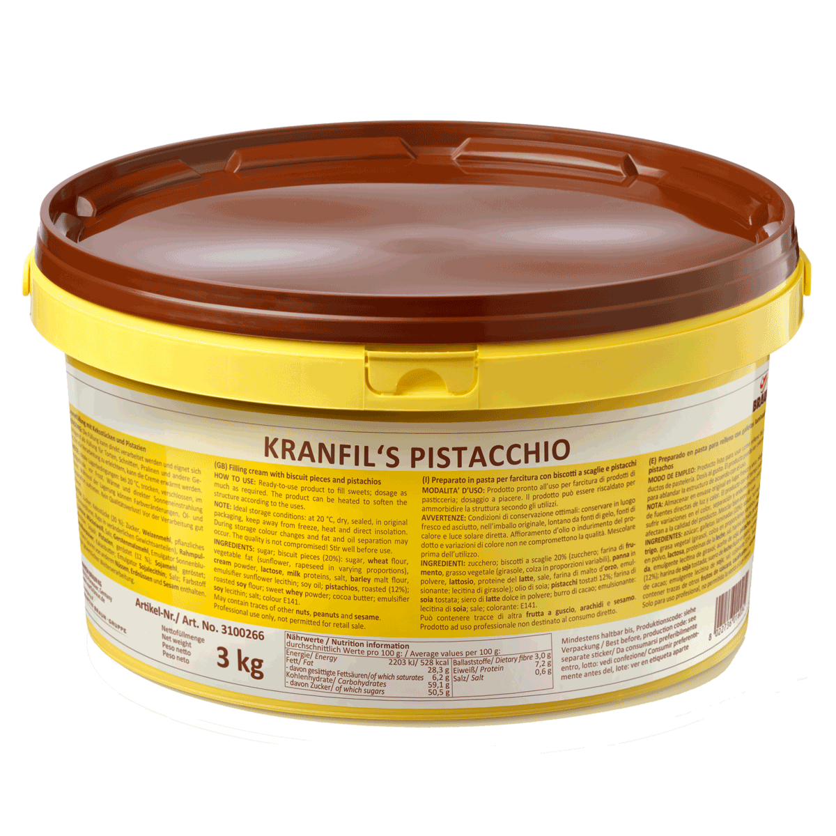 Ready to use crunchy filling with 20% biscuits in flakes and 12% roasted pistachios.