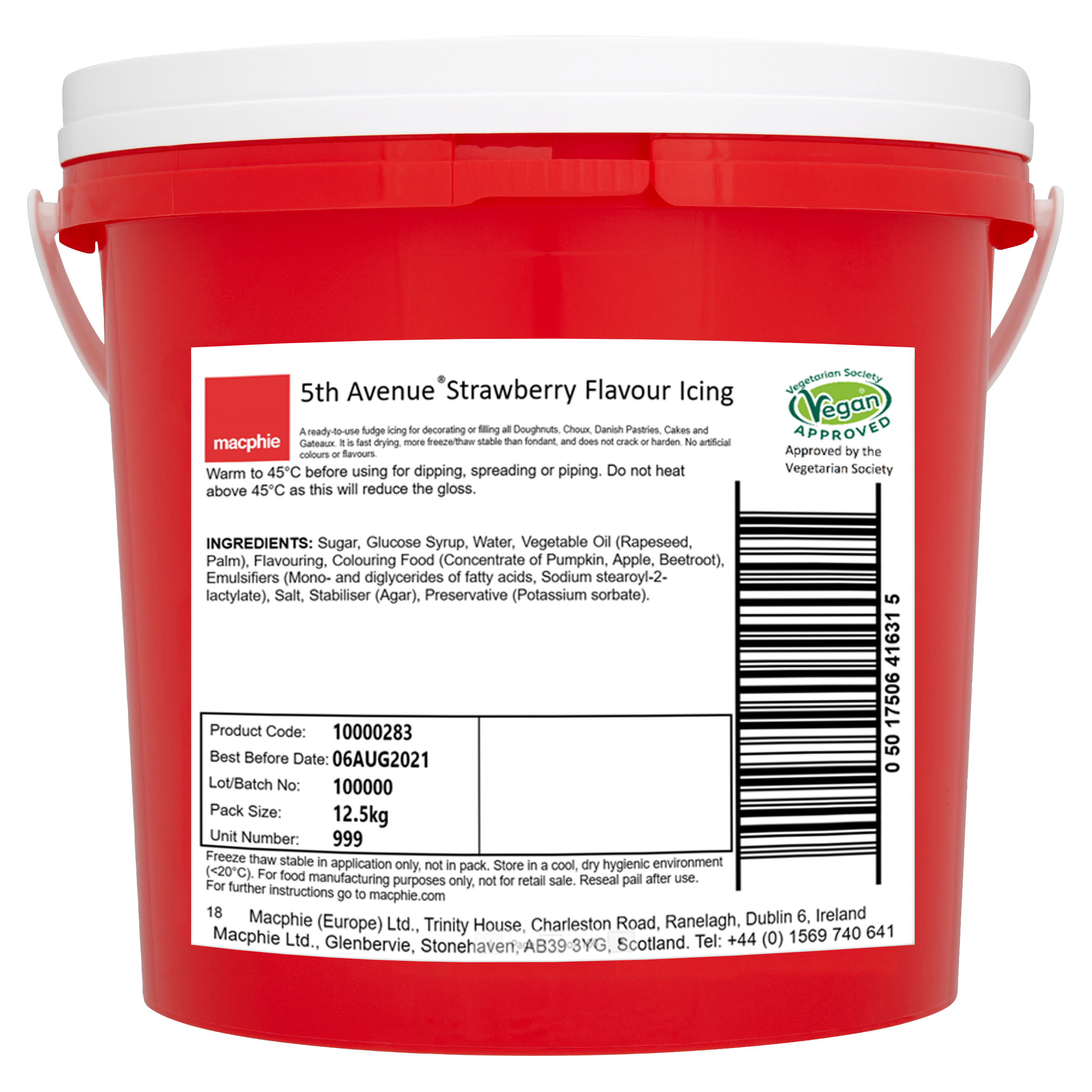 5th Avenue Strawberry Flavour Icing is a ready-to-use fudge icing, containing strawberry flavouring. It is fast drying, more freeze/thaw stable than fondant, and does not crack or harden. 5th Avenues are available in seven flavours: White, Chocolate, Dark Chocolate, Lemon, Strawberry, Caramel and Coffee.