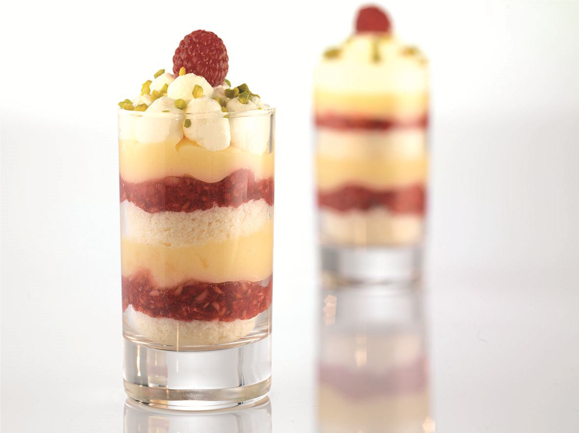 4. Mix in the pineapple dessert paste and pour into the martini glasses on top of the set raspberry Panna Cotta, allow to set and garnish with a raspberry and serve